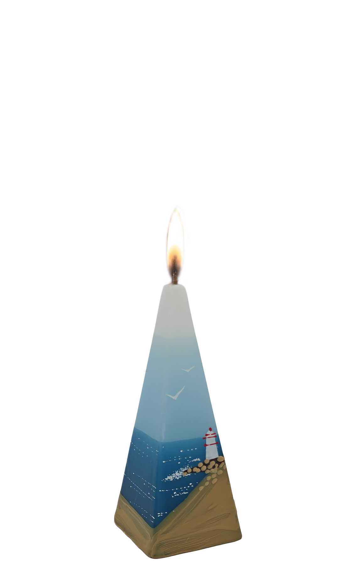 Deze unieke piramidekaars is met de hand gemaakt en prachtig gedecoreerd met een zomers tafereel van strand, zee en een vuurtoren. Een sfeervolle kaars die niet alleen warmte brengt, maar ook een decoratief accent in huis. Perfect als cadeau of voor een maritieme sfeer in je interieur.