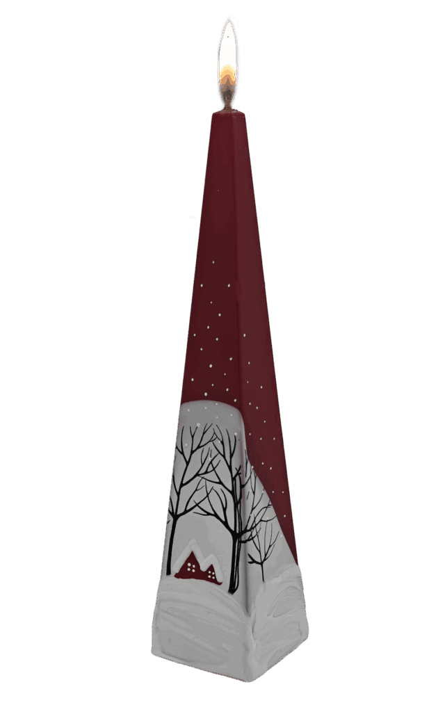 Deze in de EU handgemaakte zwart/groene piramidekaars (50×150 mm) is verfijnd gedecoreerd met een gouden kerstboom. Een elegante en moderne kaars die perfect past bij een stijlvolle kersttafel of als sfeervol cadeau.