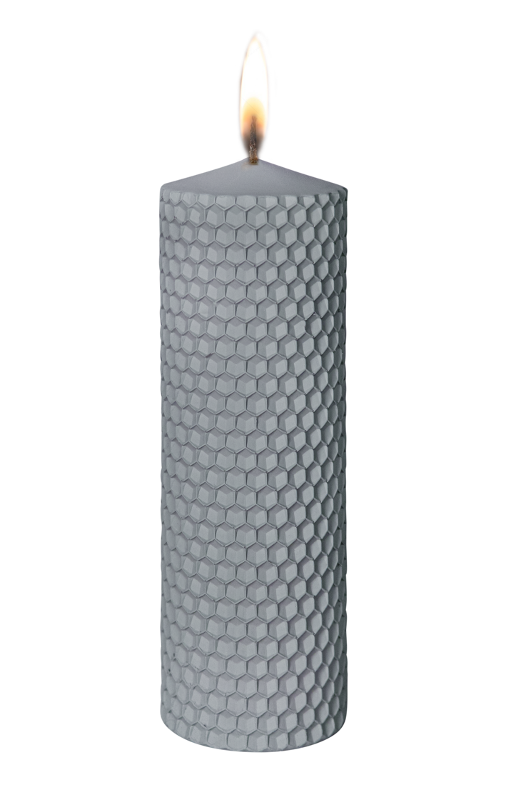 Een moderne grijze stompkaars met unieke honingraatstructuur. Combineert elegantie met eigentijdse stijl en brandt langdurig.